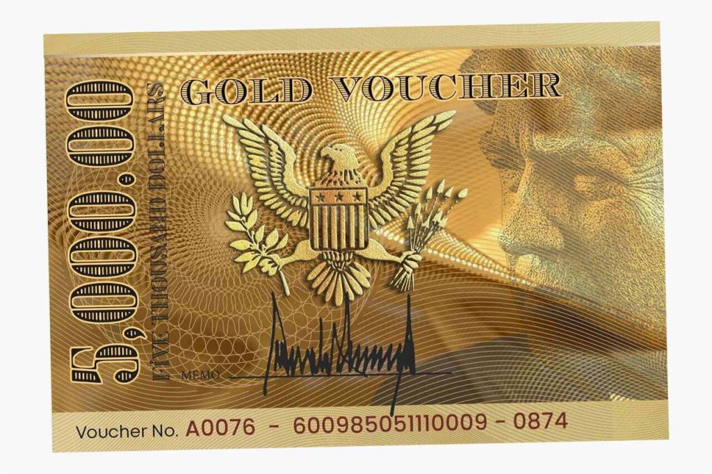 The Golden Trump Voucher is a one-of-a-kind commemorative item designed by former President Trump supporters. The Golden Voucher also expresses support for the candidate’s 2024 Presidential bid. The Golden Trump Voucher is printed on gold foil and contains the United States Treasury Emblem.