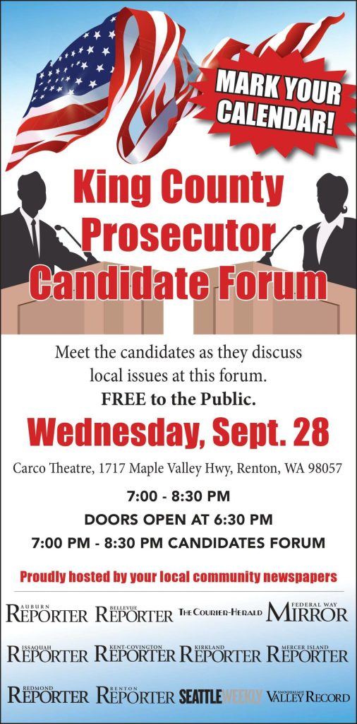 Sound Publishing is hosting a King County prosecutor candidate forum Wednesday, Sept. 28 at Carco Theatre in Renton.