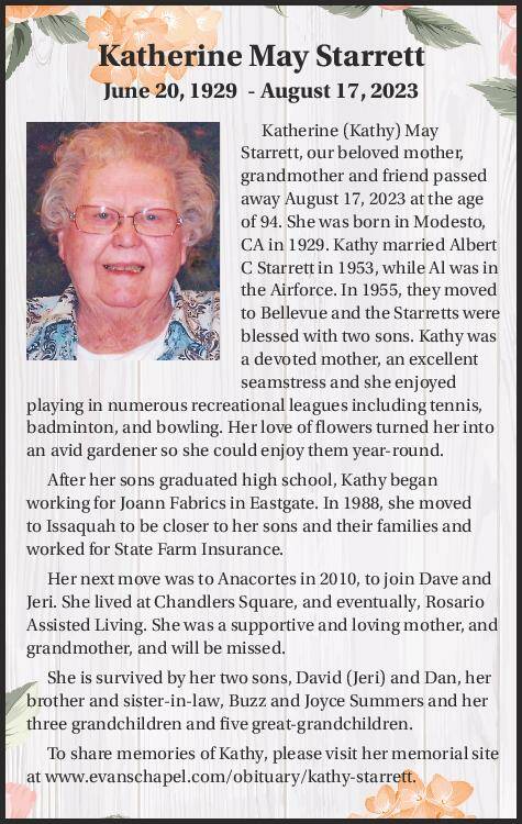 Katherine (Kathy) May Starrett, our beloved mother, grandmother and friend passed away August 17, 2023 at the age of 94. She was born in Modesto, CA in 1929. Kathy married Albert C Starrett in 1953, while Al was in the Airforce. In 1955, they moved to Bellevue and the Starretts were blessed with two sons. Kathy was a devoted mother, an excellent seamstress and she enjoyed playing in numerous recreational leagues including tennis, badminton, and bowling. Her love of flowers turned her into an avid gardener so she could enjoy them year-round.
