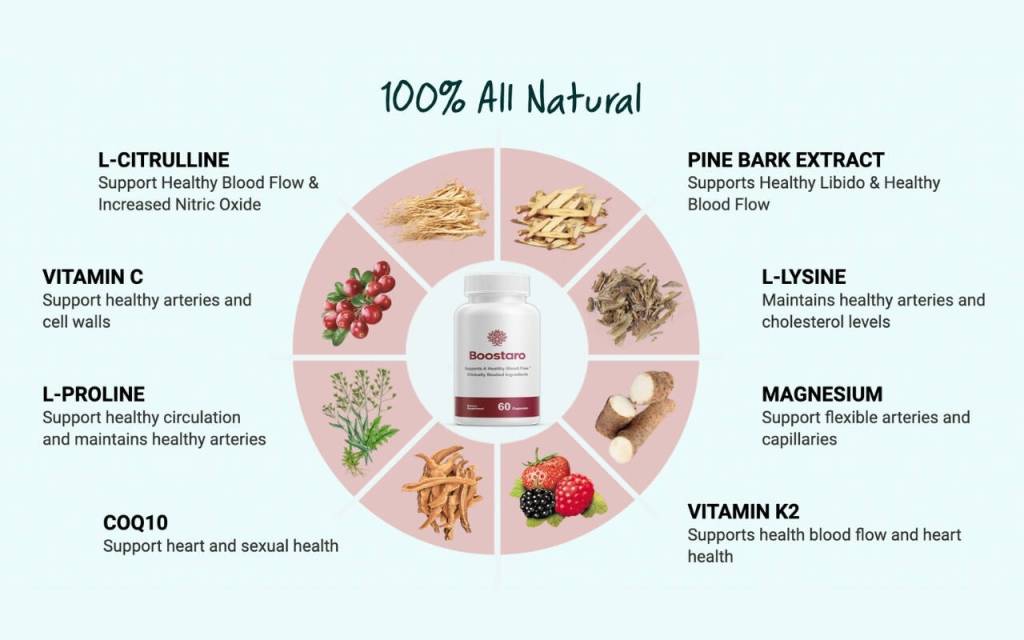 Boostaro works by using ingredients like L-Citrulline, Pine Bark Extract, and CoQ10 to support healthy blood flow, nitric oxide levels, and heart health, which are essential for maintaining healthy sexual function.