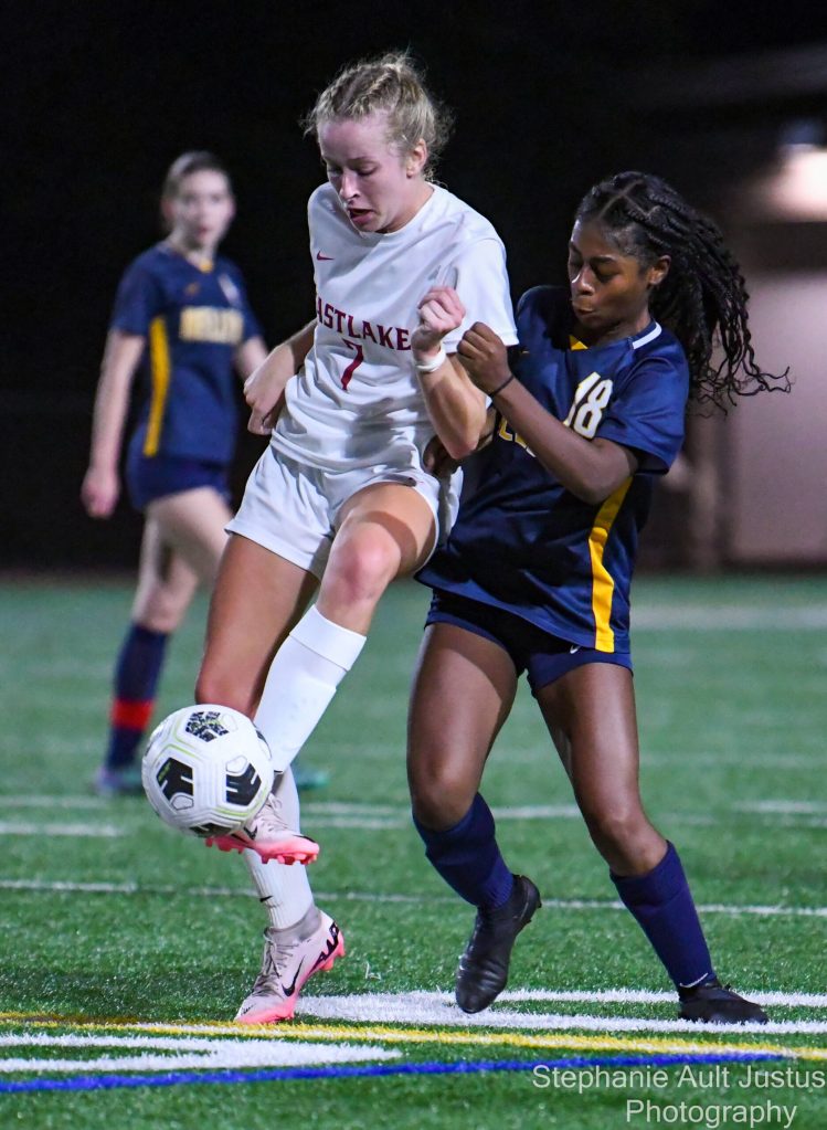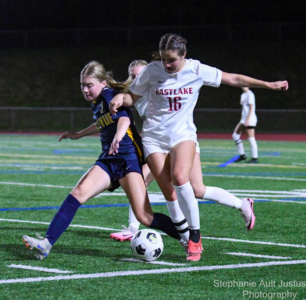 Bellevue High School’s girls soccer team defeated Eastlake High School, 1-0, on Sept. 20. Bellevue senior Kendall Gillem, left, battles Eastlake senior Grace Kinney for the ball. Photo courtesy of Stephanie Ault Justus