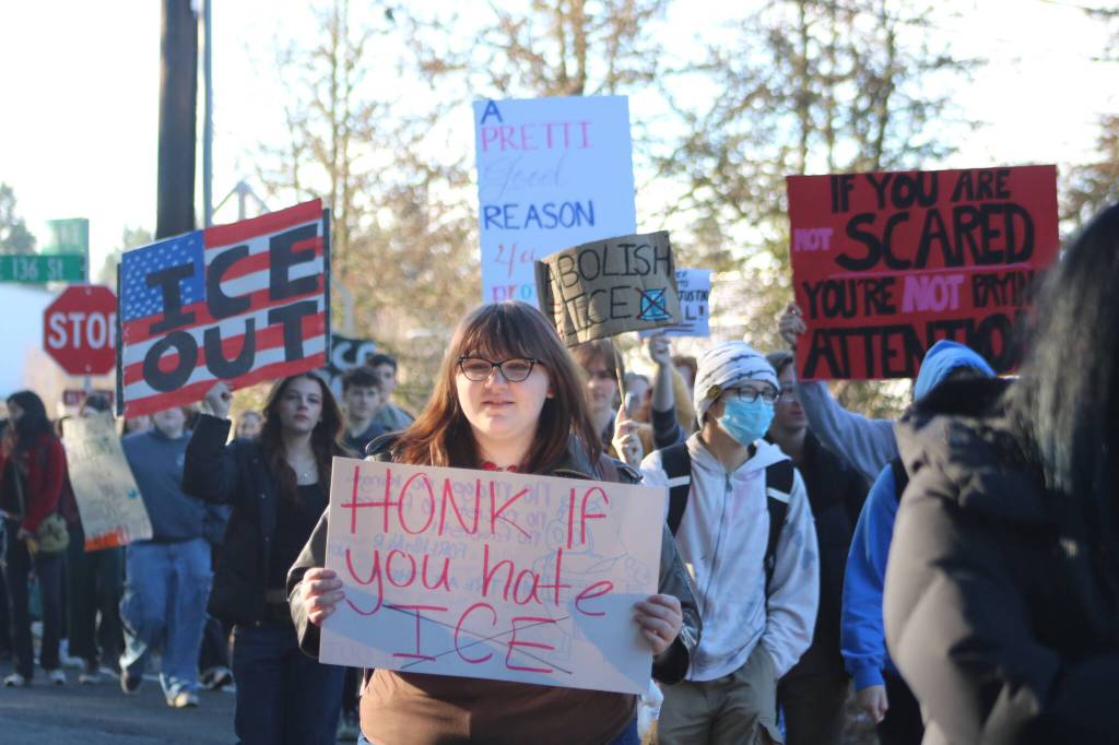 A little after 9:45 a.m. Feb. 5, the students made their way north on 168th Avenue Southeast toward the main road in the Highlands, holding signs, making chants and playing music in protest of the Trump administration and U.S. Immigration and Customs Enforcement, among other reasons.