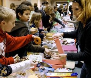 Fourth grade students purchase treats during a bake sale fundraiser to help the people of Haiti during lunch break at Sunset Elementary School on Friday.
