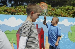 Challenger Elementary students Michael Popa and Dominic Diaz enjoy the colorful surrounds of their new play area.
