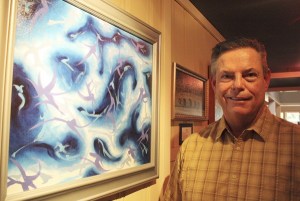 Sammamish artist Bill Proby stands in a hallway at the Issaquah Pogacha restaurant where several of his pieces are on display.