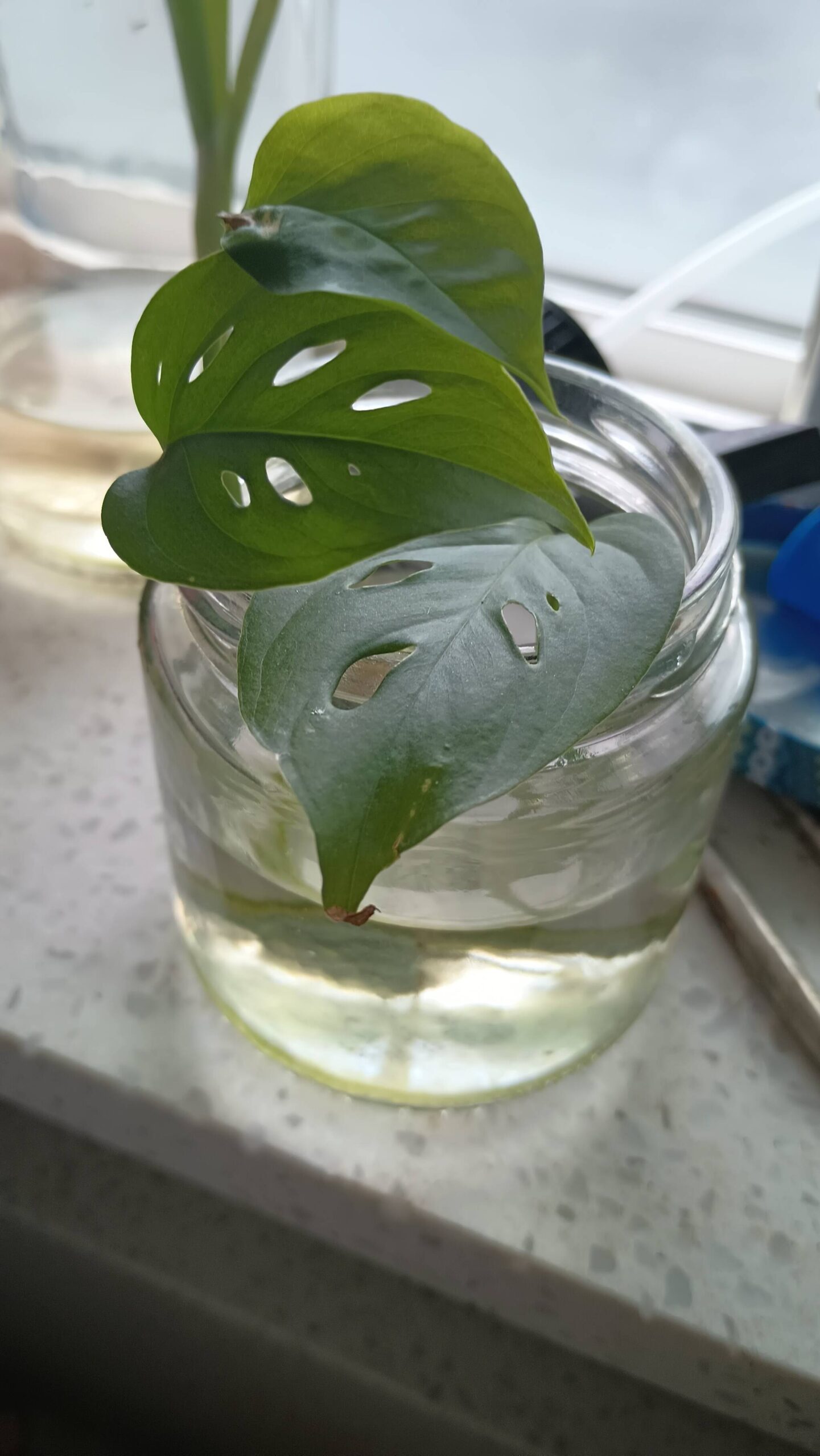 Once cut and cleaned, place the propagation in a clear glass vessel (like a jar, a bottle or a small vase) and fill it with water until the nodes are submerged and the leaves are hanging out over the side. From here, place the vessel anywhere it will get as much sun or light exposure as possible and then replace the water daily.