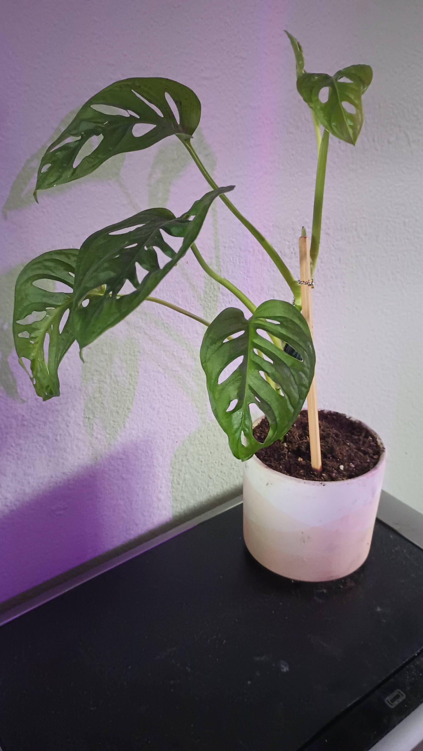 If you get a lot of sun in your home, make sure you choose plants that can handle sitting in a window frame, like succulents or any plant that you are propagating. If you have bright lighting but also a spot where your plant can be placed so that it doesn’t have direct light on it, you’ll do well with a Dumb Cane (Dieffenbachia), any Pothos or a Swiss Cheese plant (also known as the Monstera adansonii, one of my favorites). If natural light is a little hard to come by in your home, a ZZ plant or a Snake plant will be your friend. Another option for low natural lighting in the home is to use an artificial light bulb or light stand designed for house plants – the one I like to use can be found at most local hardware stores.