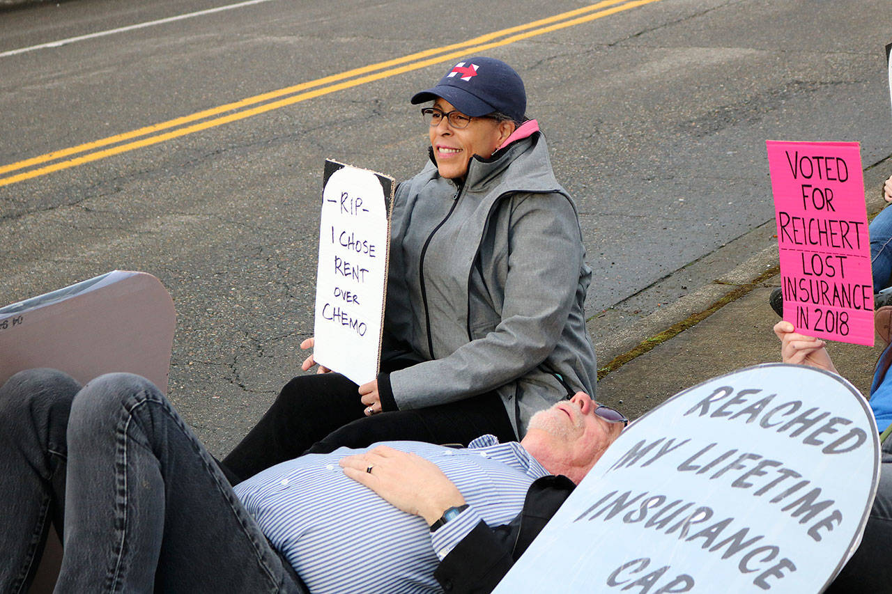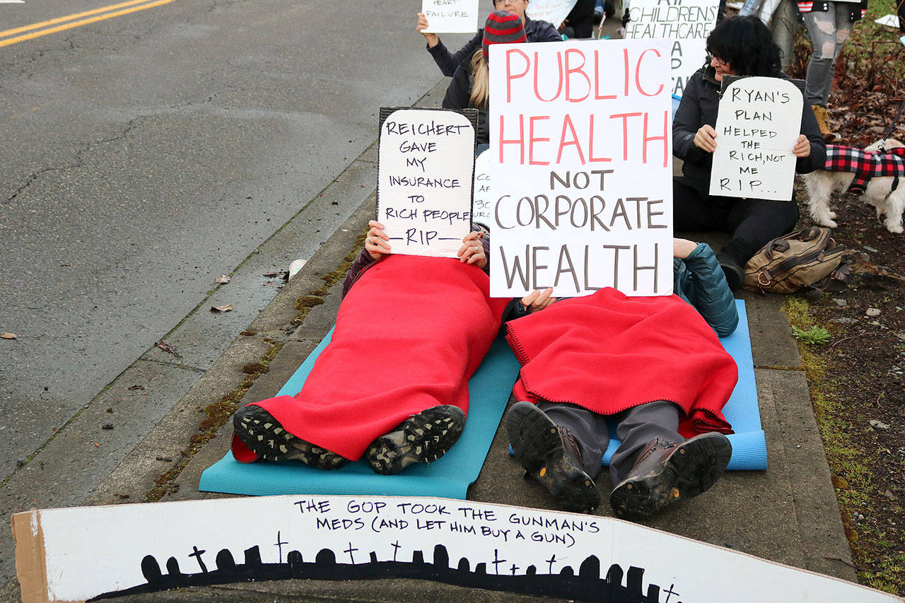 Twenty-eight American Health Care Act protesters staged a “die-in” outside of 8th District Congressman Dave Reichert’s Issaquah office on Tuesday evening ahead of Thursday’s vote on the American Health Care Act in the House of Representatives.