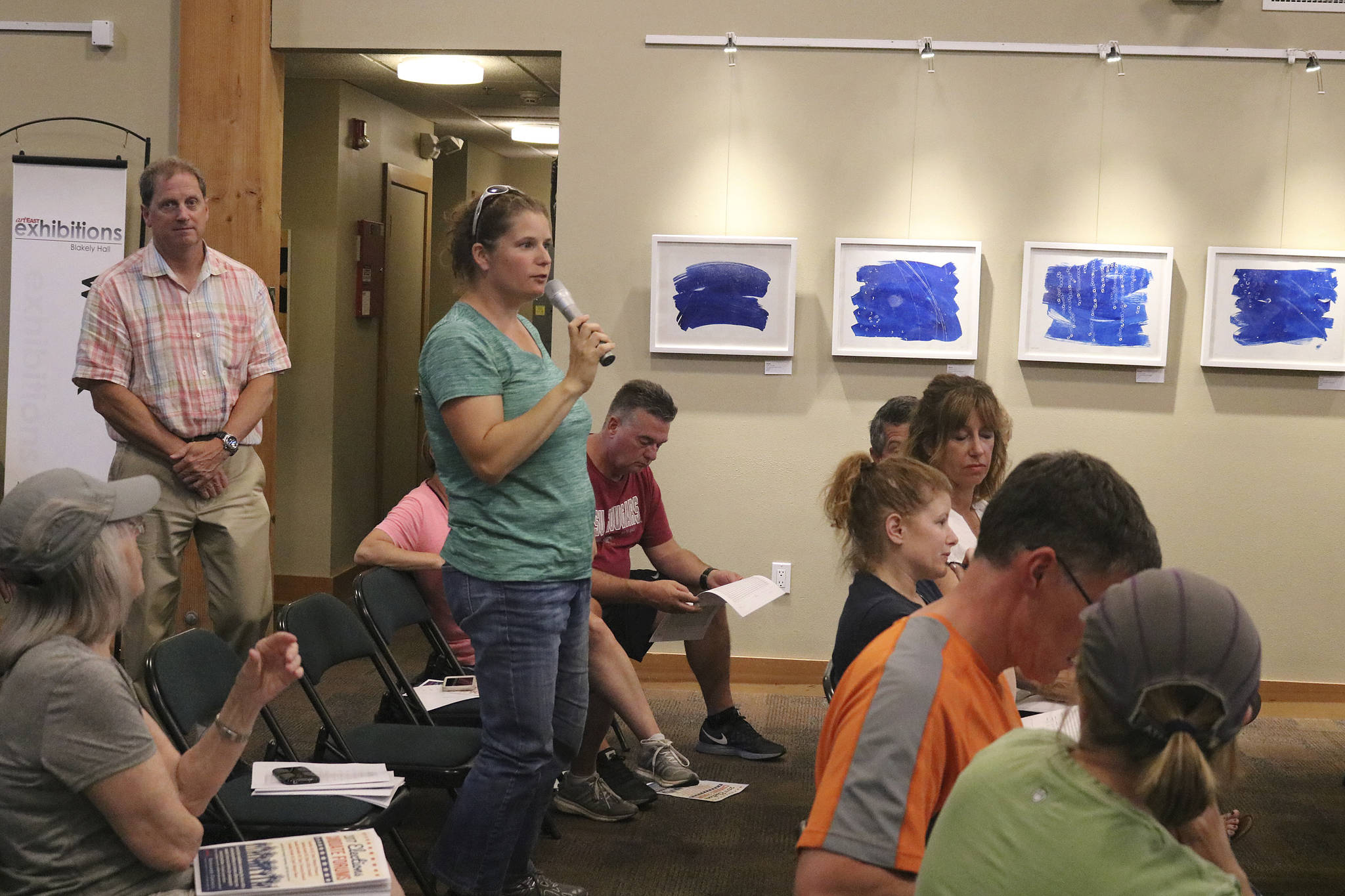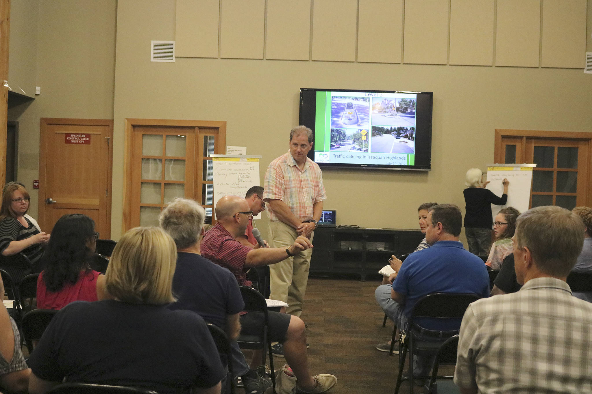Despite the fact that it was a warm and beautiful summer evening, over 50 people gathered in Blakely Hall to strategize methods to combat the rampant speeding in the family-filled neighborhood. Among the 50 were notable Issaquah faces — Mayor Fred Butler, City Council President Stacy Goodman, School Board President Lisa Callan, City Councilmember and mayoral candidate Paul Winterstein and mayoral candidate Claude Blumenzweig were all in attendance.