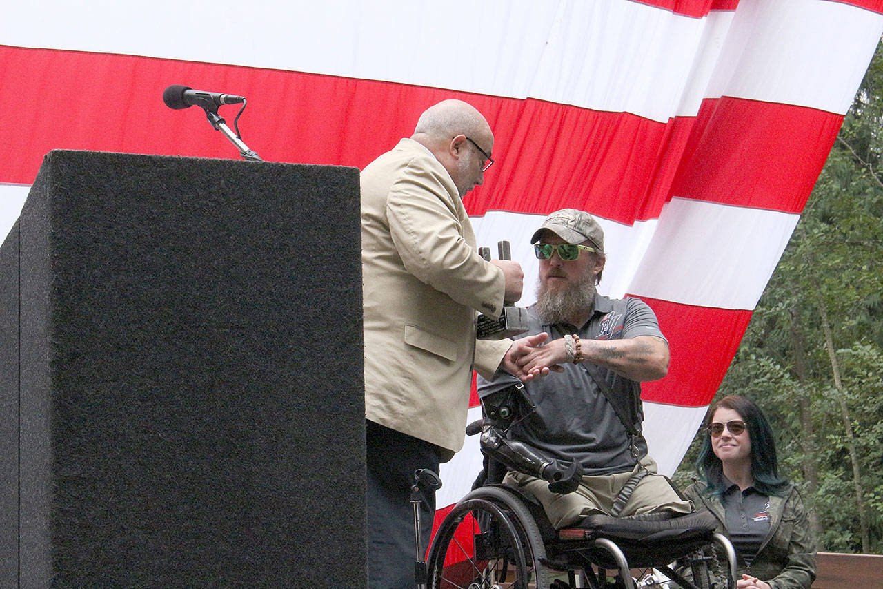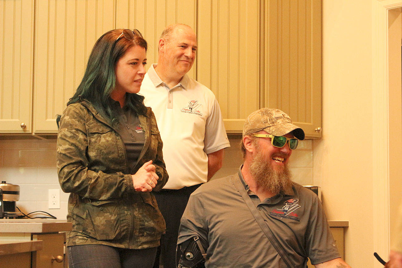 Before the unveiling of the new home, the Patriot Guard Riders presented Klein with a challenge coin for his service and sacrifice. Hodge also presented Klein with a statue made from the steel of the south tower of the World Trade Center from the Stephen Siller Tunnel to Tower Foundation.