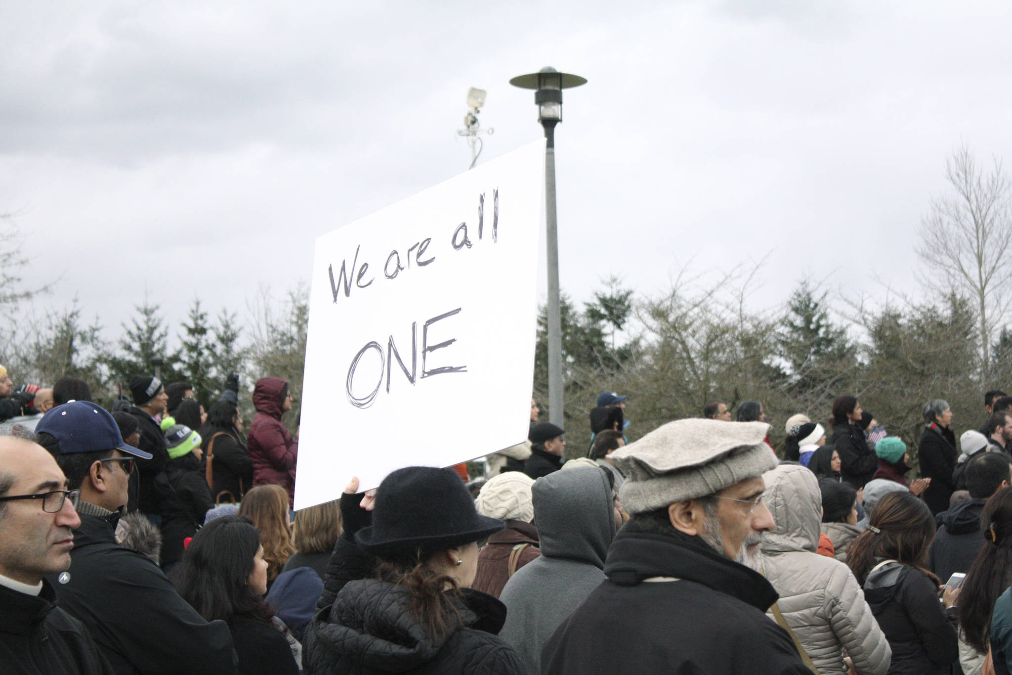 More than 250 people braved the unseasonably cold weather to hold signs, listen to messages of hope and gather in song. The crowd sang the civil rights anthem, “We Shall Overcome,” followed by the Woody Guthrie song, “This Land is Your Land.”