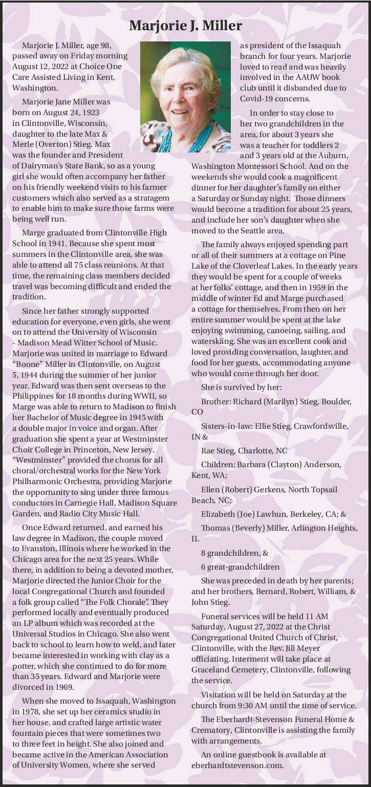 Marjorie J. Miller, age 98, passed away on Friday morning August 12, 2022, at Choice One Care Assisted Living in Kent, Washington.